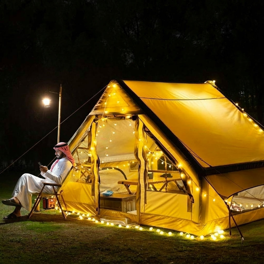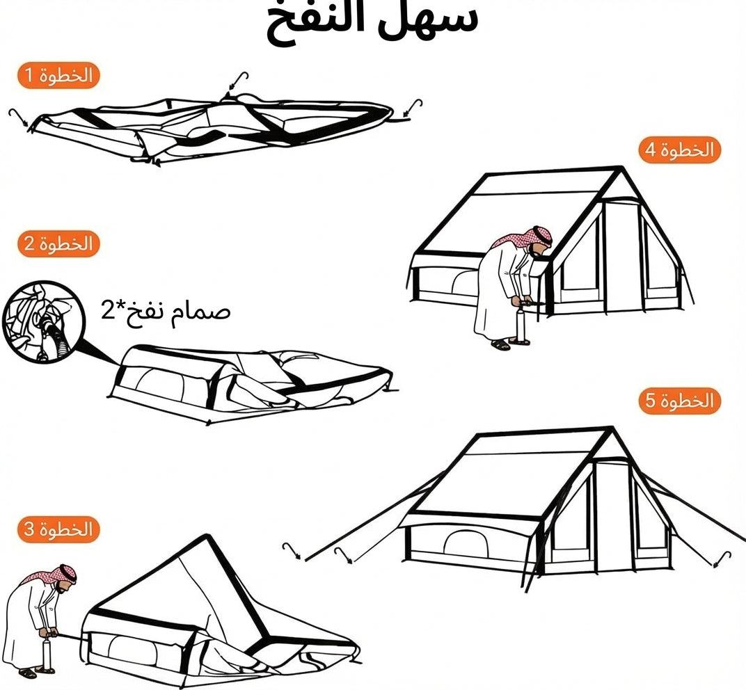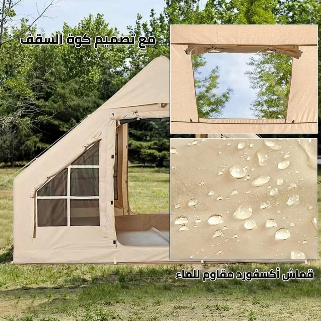 - نصب فوري وسهل: لا تحتاج لأعمدة تثبيت معقدة؛ بفضل المضخة المرفقة والهيكل الهوائي، يمكنك نصب الخيمة بالكامل في ثلاث خطوات بسيطة (أخرجها، انفخها، ثبتها).