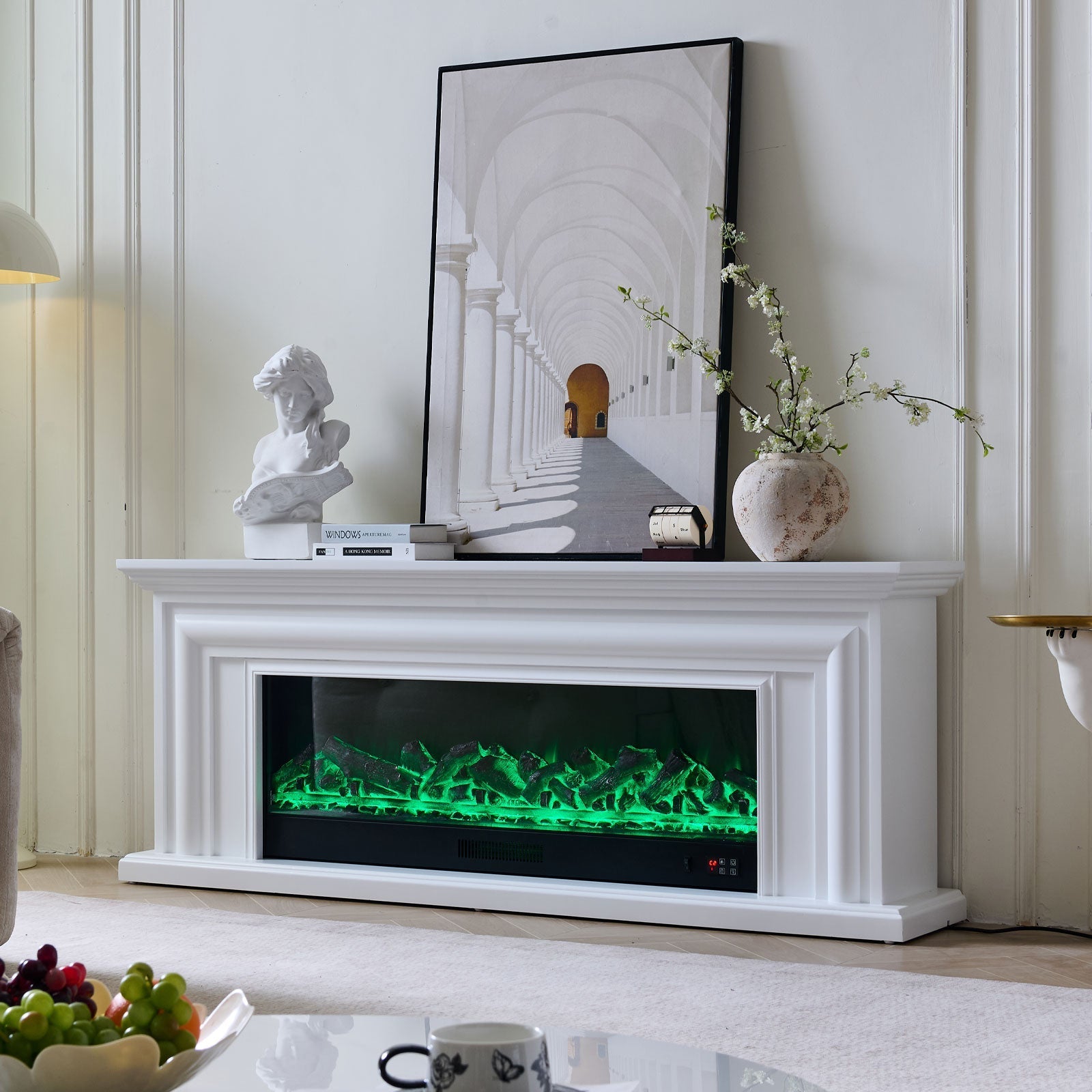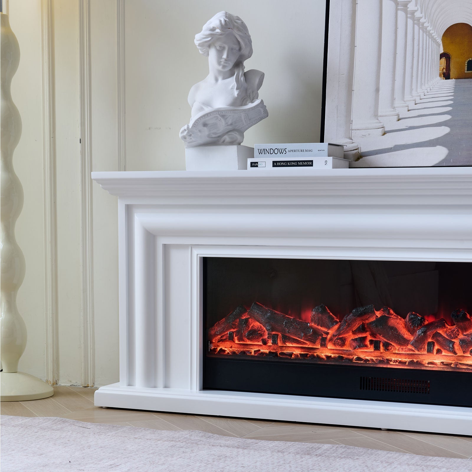 دفاية ديكور كهربائية بتصميم كلاسيكي فاخر، تأتي بلون أوف وايت أنيق يناسب المجالس الحديثة والكلاسيكية.