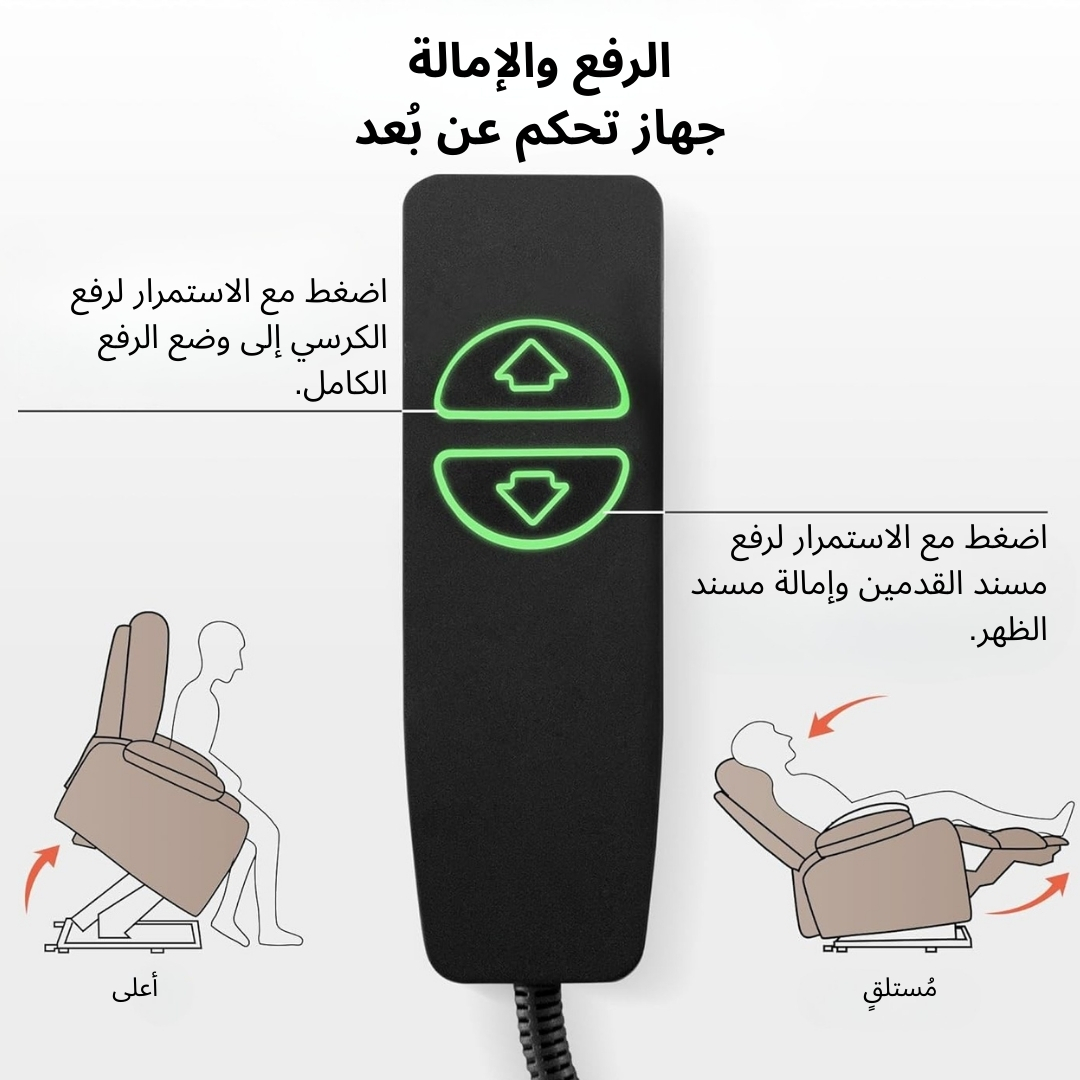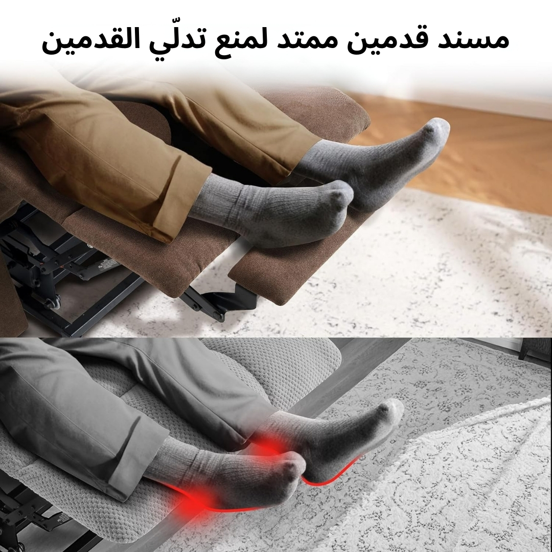 - وضعيات استرخاء متعددة: مزود بدعامة أرجل قابلة للمد (ريكلاينر) تسمح لك بالاستلقاء بزاوية مثالية لتخفيف الضغط عن الساقين والعمود الفقري.