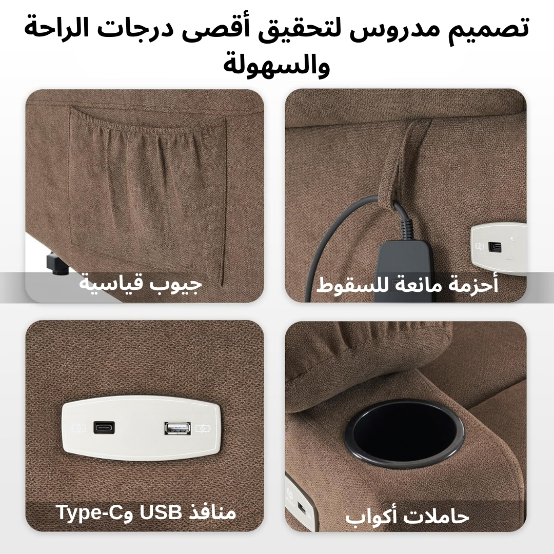 - كل ما تحتاجه بقربك: جيب جانبي واسع وعملي، مصمم لحفظ جهاز التحكم (الريموت)، الجوال، أو مجلاتك المفضلة لتكون في متناول يدك دائماً.
