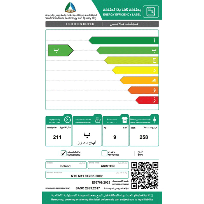 مميزات نشافة اريستون 9 كيلو بنظام التكثيف – أبيض بولندي :